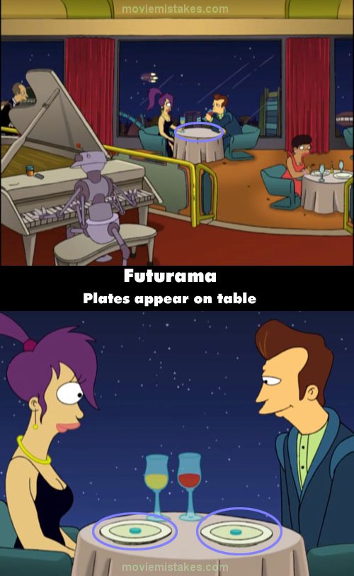 In the beginning, when Leela is on a date with the guy she says, "This restaurant is a great choice," and their glasses are on the table. When it cuts two plates suddenly appear as well.