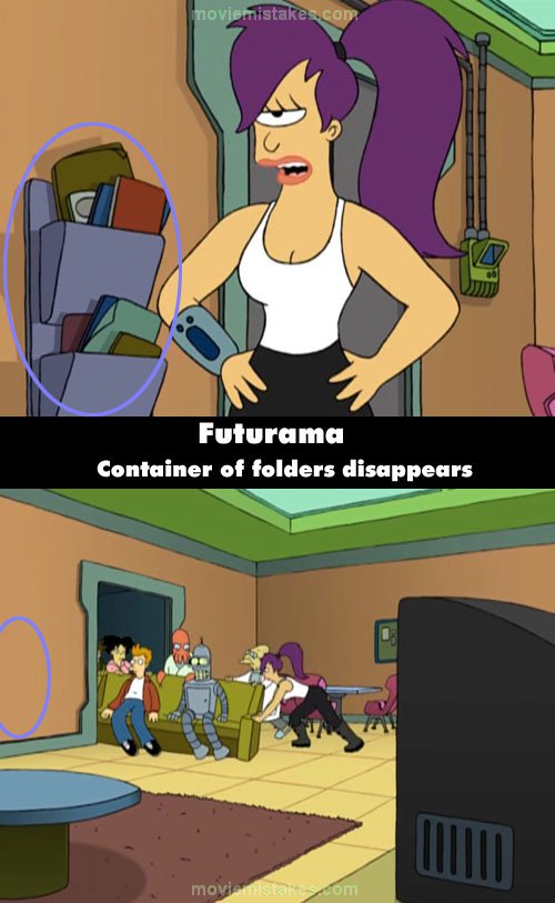 When Leela is complaining to Fry and Bender about being inconsiderate, there is a container on the wall with folders in it. When the couch gets pushed out the door, it's disappeared.