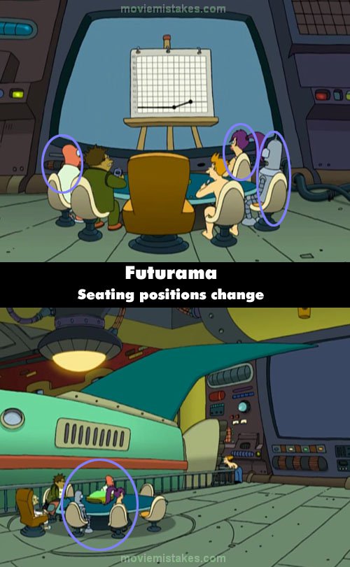 When the team are gathered round the table at the beginning of the episode, note their positions when the video screen is turned on. When they see Fry drying his hair, Leela and Bender have each moved up a chair, and Zoidberg has also moved, and seems to have taken half of his previous chair with him.