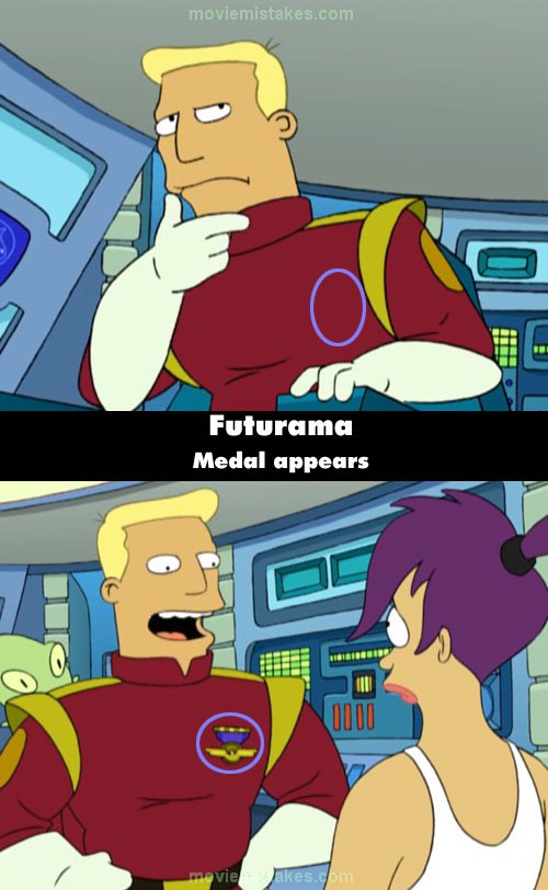 Zapp Brannigan's medal doesn't appear on his uniform until Leela arrives, and it disappears again after he shows it off.