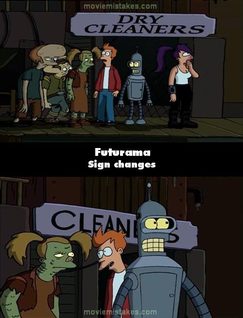 When Fry, Leela and Bender are in the mutant village they walk past a building which has the sign on it "Dry Cleaners." However, when the shot cuts to the close up, it has suddenly changes to just "Cleaners."