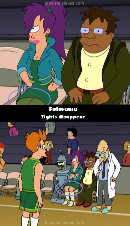 After the end of the basketball game, Leela's tights briefly disappear.