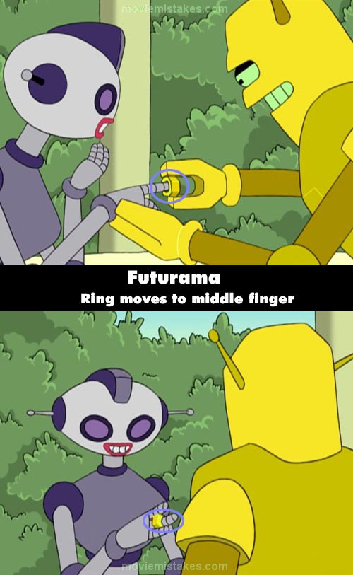 When Fry is watching "All My Circuits" for the first time, it shows Calculon screwing a golden bolt onto the index finger of a fembot's right hand. In the very next shot, the bolt is on the middle finger of her hand.
