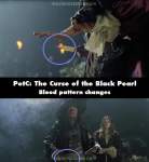 Continuity mistake: The position of Barbossa's white shirt collar varies within wide and close-up shots, during the first blood ritual with Elizabeth. (01:10:05 - 01:14:40)