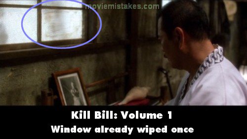 Revealing mistake: In the colour version of the battle with the Crazy 88, the Bride swings herself onto the restaurant's upper story balcony. When two of the Crazy attack her and she slashes the second one, toppling him off the balcony, he is spraying water, not blood.