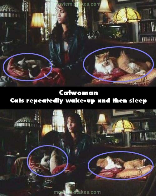 Continuity mistake: When Catwoman first meets the woman with lots of cats, she is sitting on the couch with a bunch of cats around her. The Siamese's that are next to her keep changing from sleeping, to looking at her to one sleeping and one looking at her.