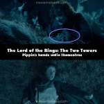 Continuity mistake: Merry and Pippin were bound when taken by the Uruk-hai, and the bonds weren't cut until after they managed to escape during the fight. Yet, when the horse almost crashed down on Pippin, he had his arms spread out up near his face, not bound, even though they weren't cut until later. In the next shot, his hands are bound again. (00:31:15)