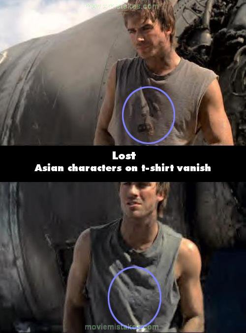 Continuity mistake: On the beach, when Shannon questions Boone about his and Locke's whereabouts everyday, Boone wears a sleeveless tee shirt with large Asian characters on the front. Then, when Boone kneels beside Shannon the entire design actually disappears. (00:09:35)