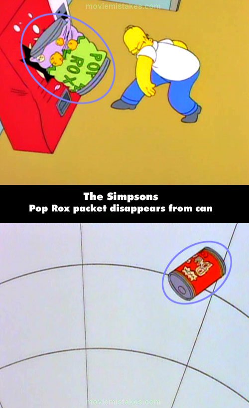 Continuity mistake: When Homer mixes the Pop Rox with the soda he leaves the Pop Rox packaging over the can. After he throws the can and we see it in the air the Pop Rox packaging has disappeared.