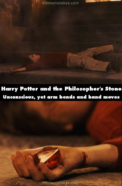 Continuity mistake: After Voldemort's soul flies through Harry, he crashes down on the stairs and his hand sticks out over one of the steps. In the next shot of Harry lying there, his hand no longer lies over the step. Harry is knocked out and could not have moved. (02:13:20)