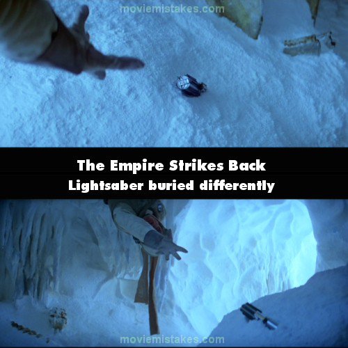 Continuity mistake: When Luke is hanging upside down in the monster's cave he uses the Force to get his lightsaber. In the shot from Luke's POV it's about 3/4 buried in snow, but in the reverse it's only about 1/4 buried.