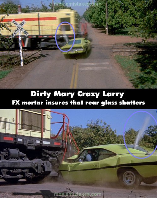 Visible crew/equipment: When the Charger hits the train, the shot from above and behind ends with the rear window shattering due to a very obvious mortar blast at the left/lower corner of the glass, which fires a white gaseous stream upward. It's seen again in slow motion from the side in the next shot as well (at the right side of the shot). (01:31:00)