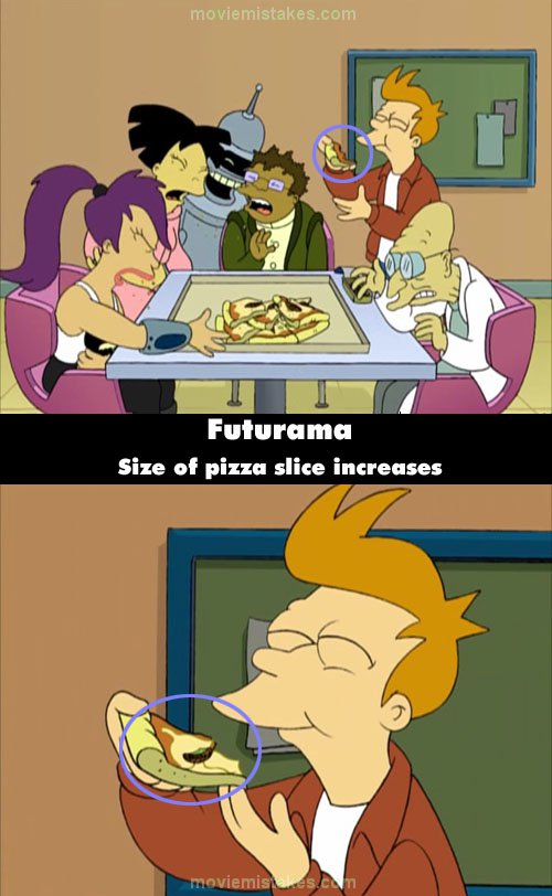 Continuity mistake: When Fry has a bite of his pizza slice, the pizza slice change size between the shots. (00:20:30)