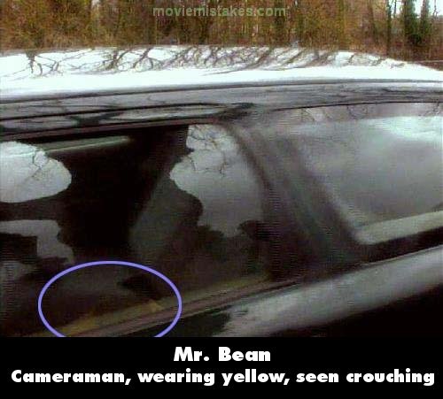 Visible crew/equipment: When Mr. Bean takes The Bus Stop sign as he drives away with another person, when the camera turns, you can see the cameraman in a yellow jacket ducking down in the bottom of the back window. Also, you can see an old man in a hat watching the filming. He is over by the tree reflected in the window. (00:16:50)