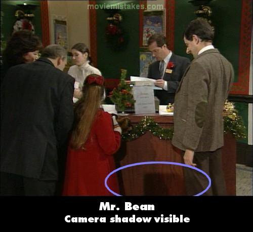 Visible crew/equipment: After Mr. Bean chooses the ornament for his Christmas tree, he takes the gold ornament over to the counter and as the camera moves closer the shadow of the camera can be seen on the desk. (00:01:15)