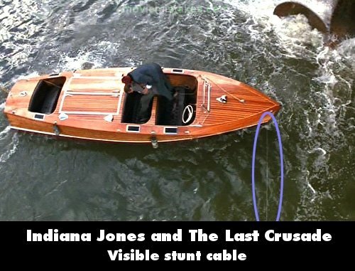 Visible crew/equipment: When Indiana and the Protector of the Grail are fighting in the boat that is about to be chewed up by the giant screw/propeller, when the angle changes to the top point of view, you can see the rope pulling the front of the boat around to position the rear for destruction... (00:39:10)