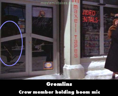 Visible crew/equipment: As Mrs. Deagle is walking along the street, carrying the broken snowman head, as she passes one store, clearly reflected, a little ahead of her, is a man carrying the boom mike. (00:10:00)