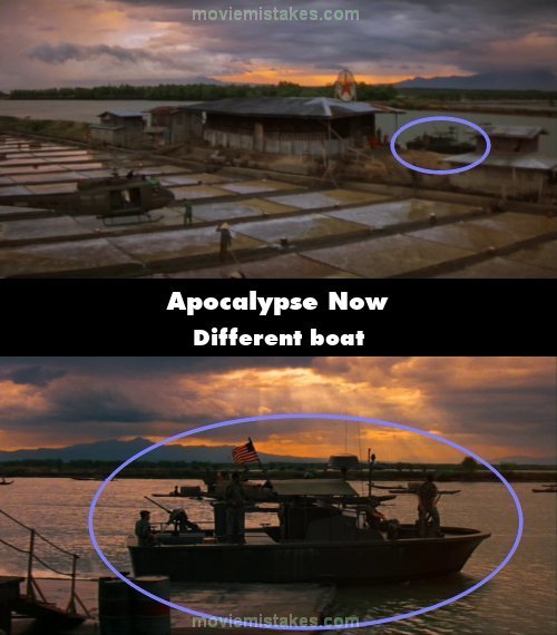 Continuity mistake: When Captain Willard flies in by helicopter to meet up with the PBR at the Texaco fuel depot, we see only one PBR with a flag waving in the front and a radar dome on the back of the roof. This is not the same boat that we see in the next shot in which the flag and radar dome are reversed. (00:19:25)