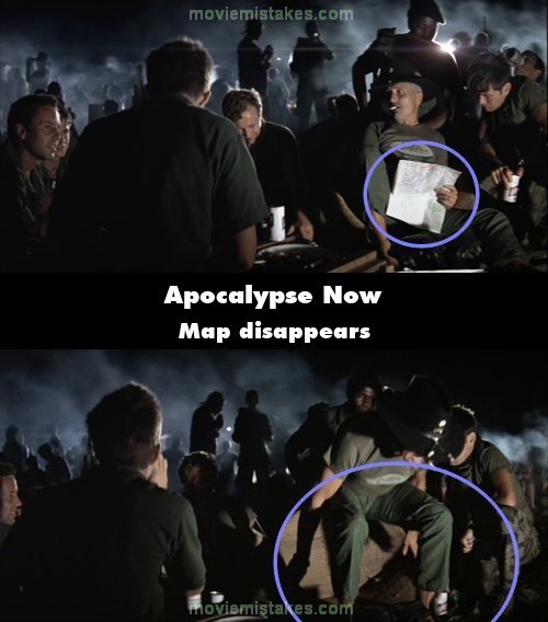 Continuity mistake: At the beach party LColonel Kilgore stands up and says, "This is the first of the ninth, Air-Cav, son". If you look closely when he stands up the map that they were just looking at is gone. The colonel was holding it, but he doesn't have it nor does Captain Willard. (00:33:40)