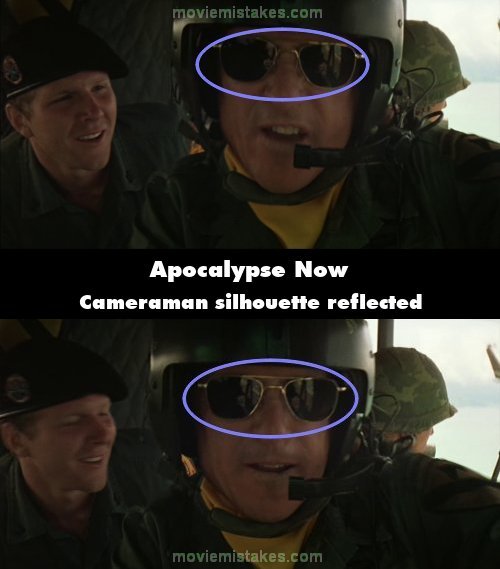 Visible crew/equipment: In the helicopter after Colonel Kilgore talks to Lance he says, "My boys love it" and you can see the silhouette of the crouching cameraman in his sunglasses. (00:36:50)
