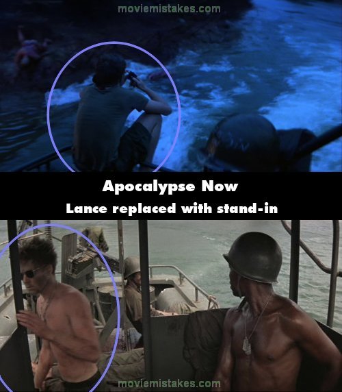 Visible crew/equipment: After Clean is killed there's a shot of Lance sitting on the back of the boat holding a mirror in his right hand. This is not the actor Sam Bottoms but a longer haired thinner stand-in who's not wearing the black wristwatch that Sam wears in every other scene in the movie. (01:54:10)