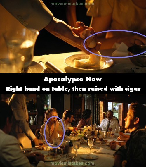 Continuity mistake: After the gentleman in the tan jacket spills the egg into the plate, between shots Roxanne goes from having her right hand on the table to having her right hand near her mouth holding her cigar. (02:07:30)