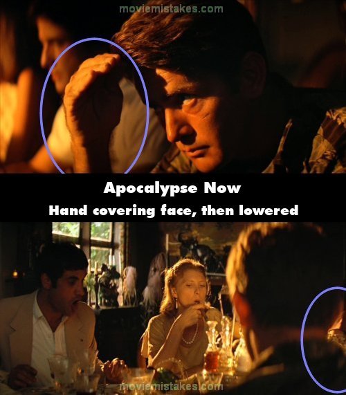 Continuity mistake: In a shot from behind his head Captain Willard sits and looks at Roxanne as the man in the tan jacket to the left of her says, "Look, Captain". In the next shot the captain's right hand is raised shielding his eyes from the sunlight. (02:07:15)