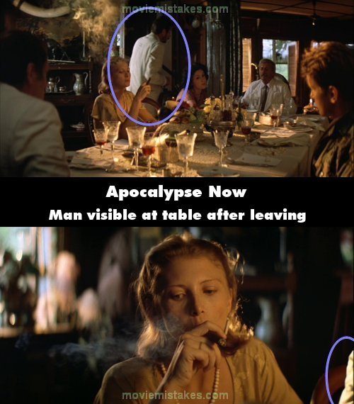 Continuity mistake: Hubert says to Captain Willard, "We took the Vietnamese, work with them, make something" and the guy sitting on the right of Roxanne who got up and left several shots ago is back. (02:12:15)