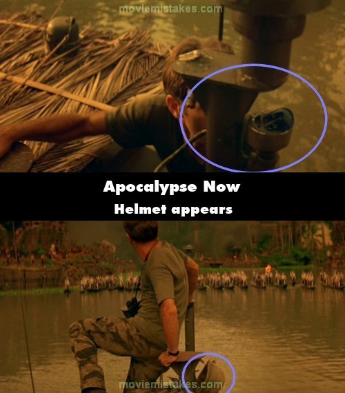 Continuity mistake: As they approach Kurtz' compound Captain Willard climbs up to the top of the boat. As he's climbing there's no helmet hanging off the light pole in front but in the next shot as he reaches the top a helmet appears. (02:27:40)