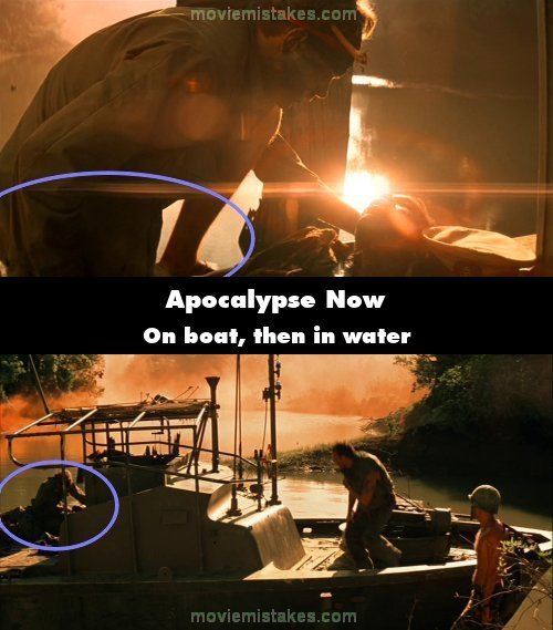 Continuity mistake: As Lance prepares Chief Phillips' body for burial at sea his left foot is on the side of the boat. In the next shot of Chef talking to Captain Willard, Lance is already in the water. (02:23:55)