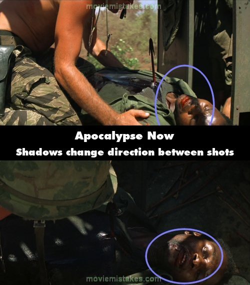 Continuity mistake: Look closely at the shadows going across Chief Phillip's face just before he tries to kill Captain Willard. First they're going from left to right, then in the next shot when he grabs the captain's head, they're going from right to left. This happens several other times in the scene. (02:23:05)