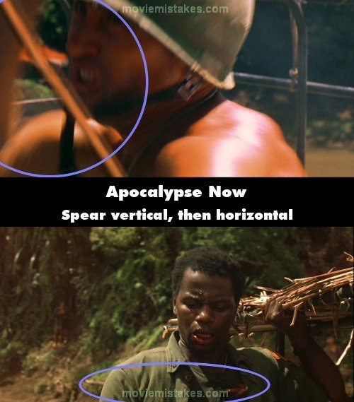Continuity mistake: One spear is thrown and it goes through Chief Phillips horizontally, but in the close-up shot of Captain Willard a fraction of a second before the impact we see the spear in a vertical position in front of the captain's face. (02:22:30)