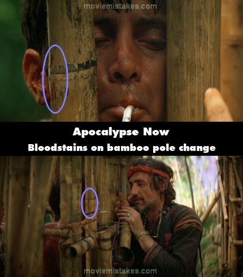 Continuity mistake: As the captain smokes his cigarette Dennis Hopper says " but he's got something in mind for you, aren't you curious about that". The bloodstain on the bamboo pole to the left of the captain disappears between shots. (02:43:25)