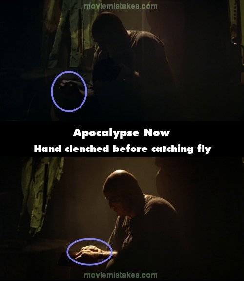 Revealing mistake: Colonel Kurtz reaches down and catches a fly in his hand and then lets it go. If you look closely the four fingers of his right hand are clinched when he reaches down because the fly is already in his hand. (02:55:00)