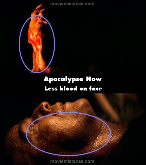 Continuity mistake: Just before Colonel Kurtz falls to the ground we catch a glimpse of him with blood running from the top of his head down the right side of his face. Several seconds later as the lies on the ground dying there are only a few small drops of blood on the right side of his face. (03:08:05)