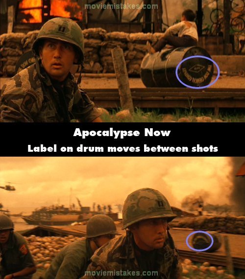 Continuity mistake: When Francis Ford Coppola appears in the movie as a TV director, he asks the captain to, "Just keep on going," and a small boy is playing on a black Agent Orange drum in the background. If you watch the labeling on the drum you can see that it's been moved between shots. (00:25:50)