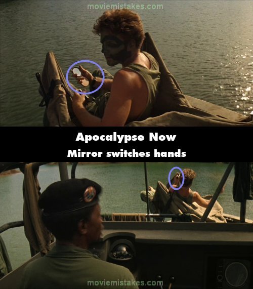 Continuity mistake: As Chef and Clean have a verbal fight after they leave the Medevac Lance is in the front of the boat putting on camouflage while holding a mirror in his right hand. In the next shot he's leaning on his right arm and holding the mirror in his left hand. (01:33:20)