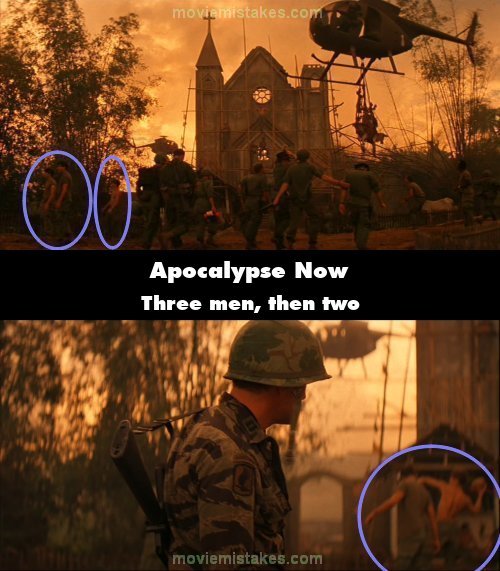 Continuity mistake: After Lance, Kilgore and his surfing buddies walk away we see three guys playing football and the one without a shirt has his hands up in the air waiting for a pass. In the next shot there are only two men and the shirtless guy is now throwing the football. (00:30:40)