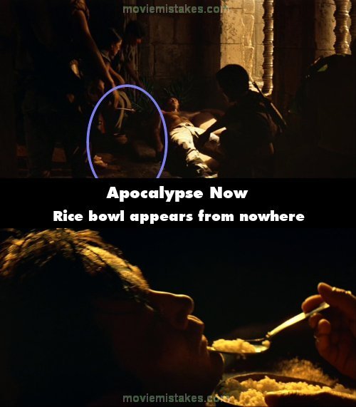 Continuity mistake: After the woman gives Captain Willard some water she tries to feed him rice from a spoon, which he doesn't eat. In the previous wide shot of the entire area there is no bowl of rice anywhere, there is only the pitcher of water at her feet and the rice bowl just appears. (02:53:55)