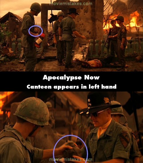 Continuity mistake: Colonel Kilgore walks over to a VC soldier with a stomach wound and one of his soldiers follows behind carrying a thermos with an orange cap in his right hand and nothing in his left. Kilgore turns and says to this soldier, "Give me that canteen" and in the next shot the canteen appears in his left hand. (00:29:20)