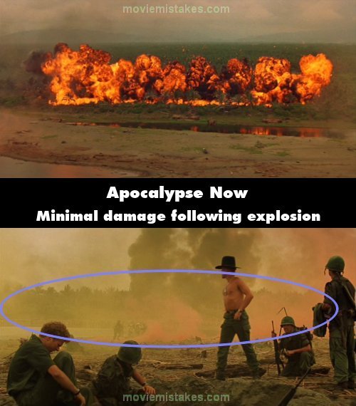 Continuity mistake: The actual napalm attack burns quite a large area of the tree line and just two shots later Colonel Kilgore speaks the famous lines, "I love the smell of napalm in the morning!" At this time, when we see this area is still smoking, quite heavily, however, the amount of destruction is much less and there is very little fire visible. (00:48:55)