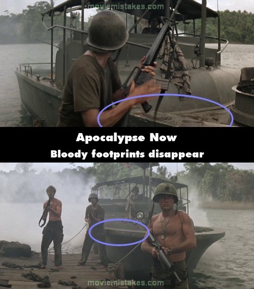 Continuity mistake: As they listen to the Frenchmen on the plantation dock, Chef picks up his rifle from the side of the boat. Note this spot and the bloody footprints there, which appear and disappear between shots. (01:57:40)