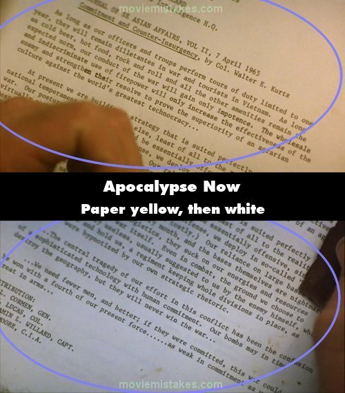 Continuity mistake: As Captain Willard holds Colonel Kurtz' paper titled, "Commitment and Counterinsurgency" in front of the camera it changes color from yellow in the first shot to white in the second. (01:15:40)