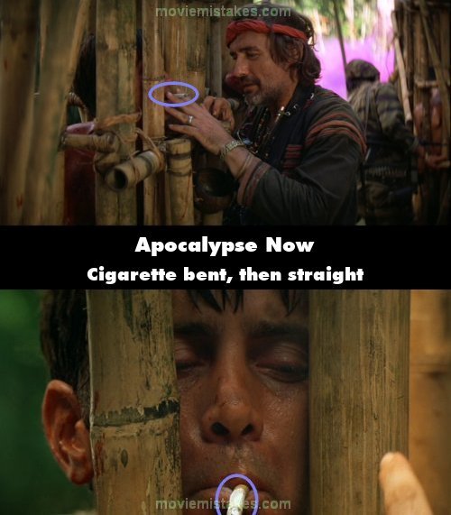 Continuity mistake: The cigarette that Dennis Hopper hands to Captain Willard is lit and in perfect shape, however in close-up the cigarette is bent near the filter. In the next shot it is once again in perfect condition. (02:43:20)