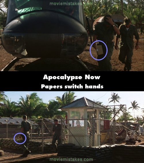 Continuity mistake: Captain Willard and his two escorts get out of a helicopter and walk up to the guard post on the way to see General Corman. The soldier in the front is carrying some yellow papers in his right hand. In the next shot as they pass the guard the papers are in his left hand. (00:09:40)
