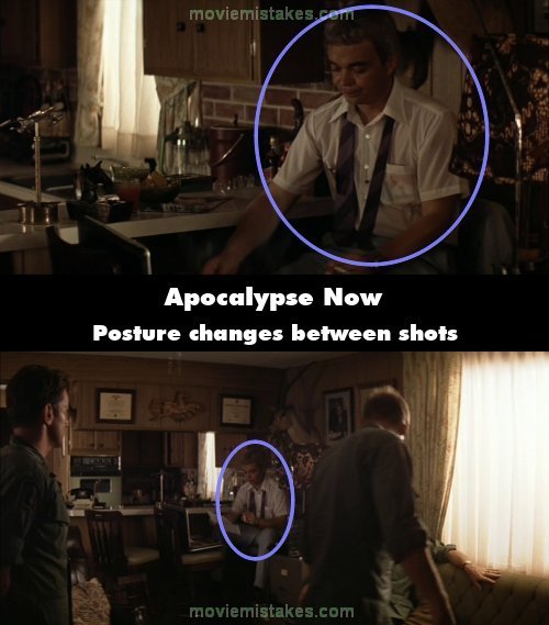 Continuity mistake: Harrison Ford lights up his cigarette and Captain Willard says, "I'm not presently disposed to discuss those operations sir." Jerry is sitting with his back almost up against the wall. In the next shot as he takes a puff from his cigarette he's moved and is now leaning forward. (00:10:45)