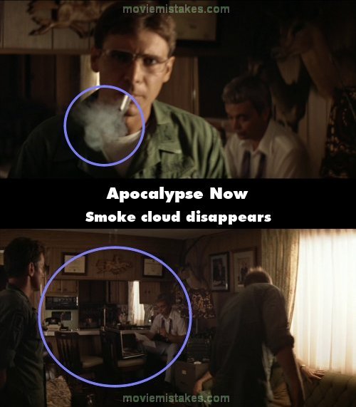 Continuity mistake: As he speaks to Captain Willard in the general's residence, Harrison Ford lights up a cigarette, leaving a big puff of smoke in the air behind him as he walks away. In the next shot the air is clear without a trace of smoke. (00:10:40)