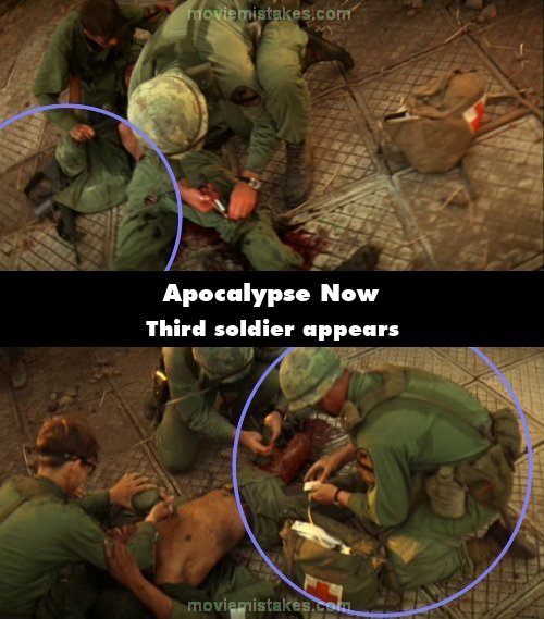 Continuity mistake: In the first close-up shot of the soldier wounded in the Vin Din Dop courtyard there are two medics working on him. In the next shot there is a third kneeling by his left leg in the exact spot where the cameraman just stood in the previous shot. (00:43:20)