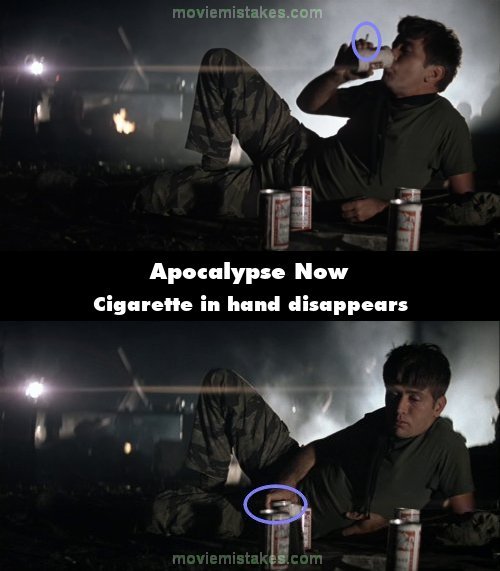 Continuity mistake: During the beach party as Captain Willard is saying, "He was one of those guys that had that weird light around him." Note he is holding a cigarette and drinking a Schlitz, with four cans of Budweiser in front of him. In his next shot, just seconds later, there is another can of beer and the cigarette is gone despite the fact he has not moved at all. (00:32:00)