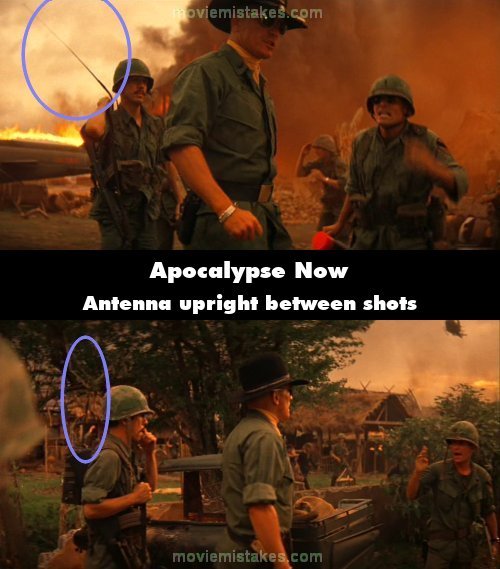 Continuity mistake: Colonel Kilgore walks away from his helicopter saying, "Body cards, bring my body cards." Behind him is a radioman and an antenna that is kinked at a 45 degree angle. Two shots later the antenna is standing straight up without adjustment. (00:27:10)